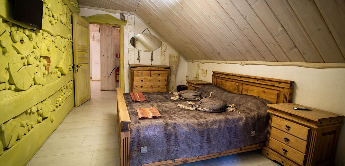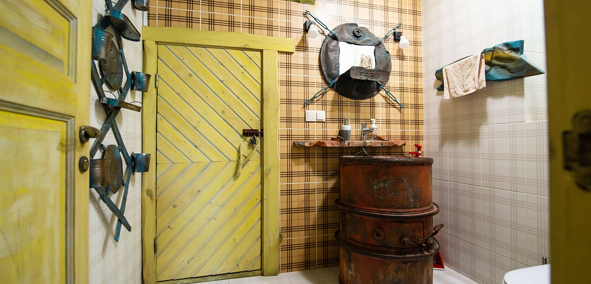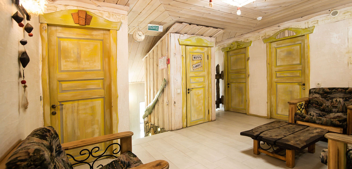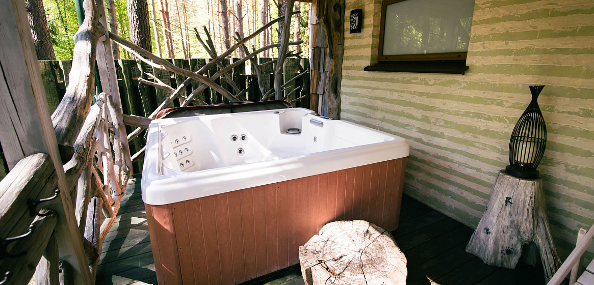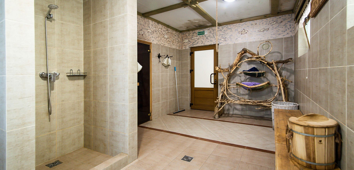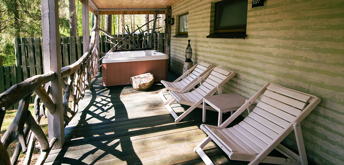 Здесь же на первом этаже расположена баня на дровах с двумя душевыми, обливным ведром и выходом к джакузи на летнюю террасу с шезлонгами. Два часа бани включены в стоимость проживания. Джакузи работает в теплое время года: с мая по октябрь.