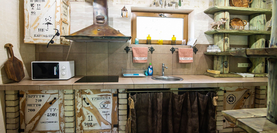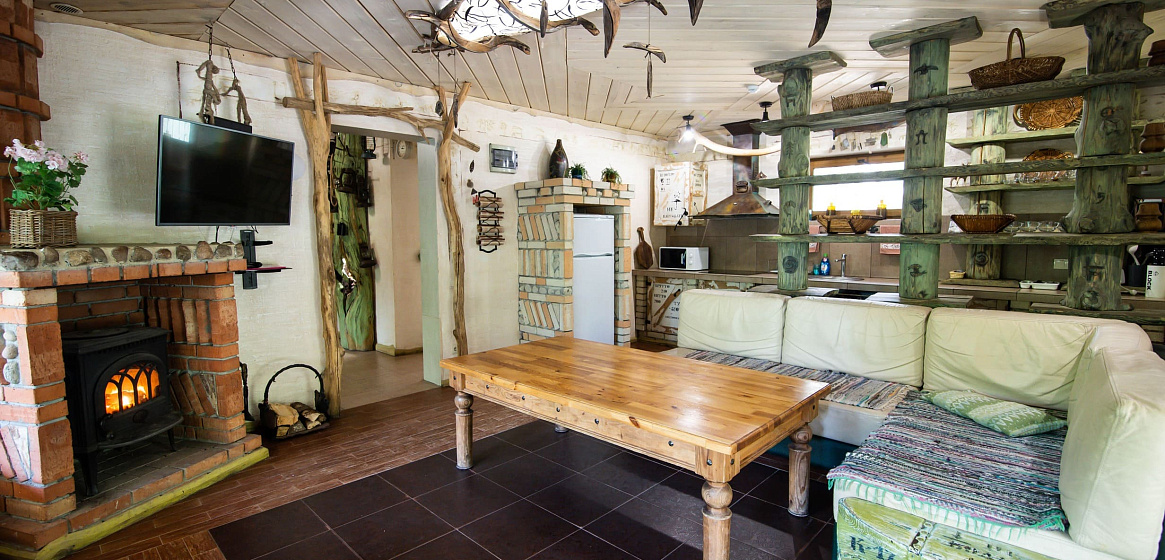 На первом этаже гостевого дома расположена уютная зона общего пользования: кухня-гостиная с камином, спутниковым TV, окнами в пол, столовой зоной на 10 человек. На кухне хозяйки обнаружат все необходимое для приготовления и хранения продуктов – индукционная плита с набором посуды, холодильник, посудомоечная машина на 8 комплектов, печь СВЧ, чайник, кофеварка для кофе по-турецки, посуду и приборы на количество проживающих.