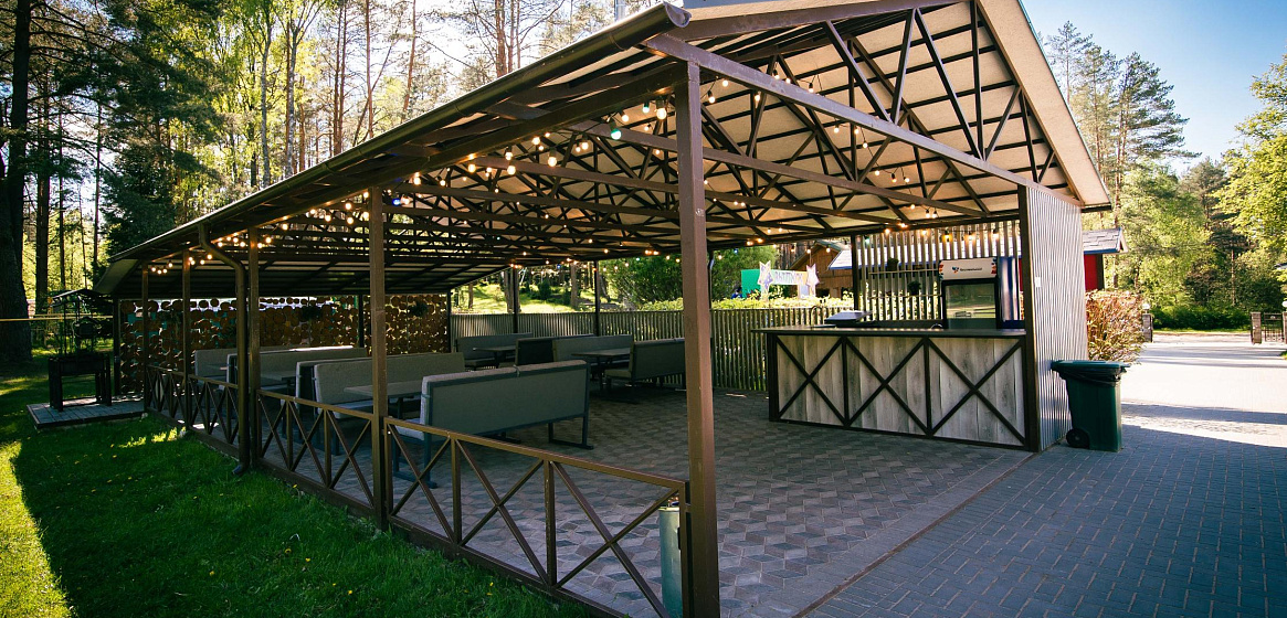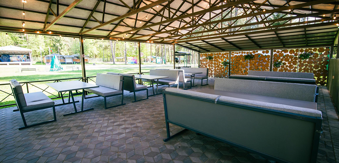 Это уютное и атмосферное пространство с крышей на свежем воздухе. Здесь легко спрятаться от полуденного летнего солнца или грибного осеннего дождя, оставаясь при этом на улице и наслаждаясь ароматом сосен. Сидя за столиком, можно наблюдать за насыщенной событиями жизнью посетителей «Фестивального», ведь из кафе открывается панорамный вид на центральную площадку со сценой и спортивно-игровыми полями.