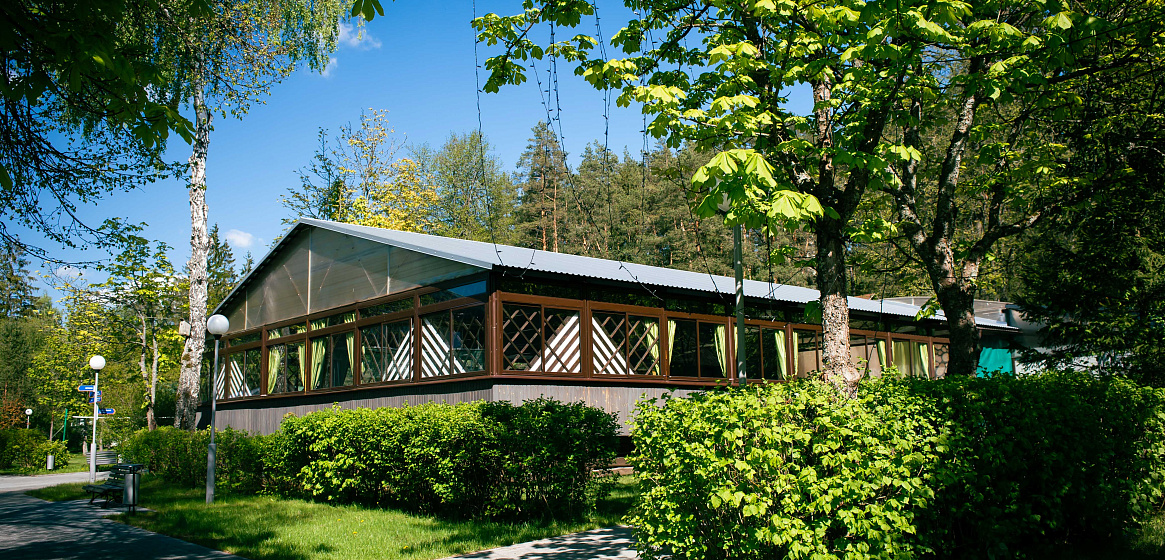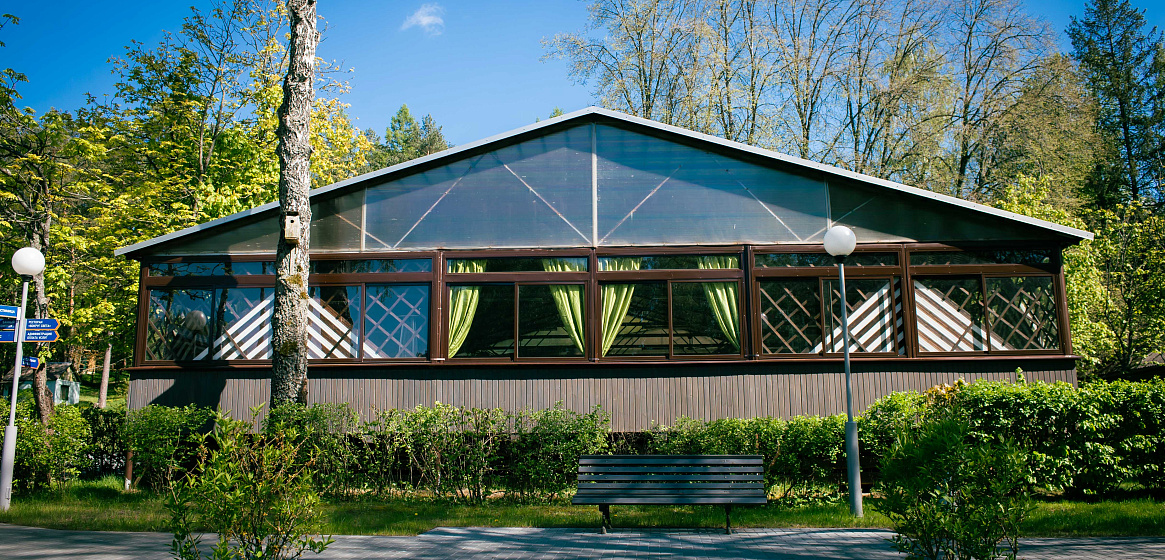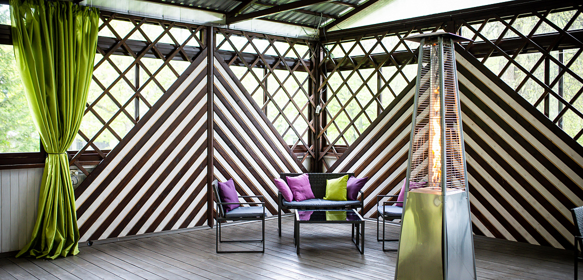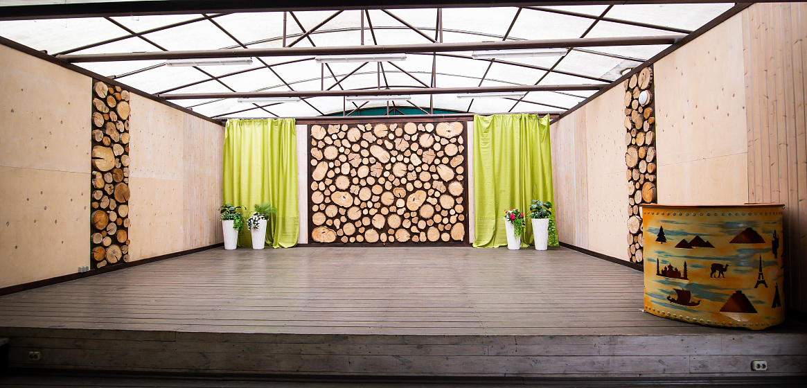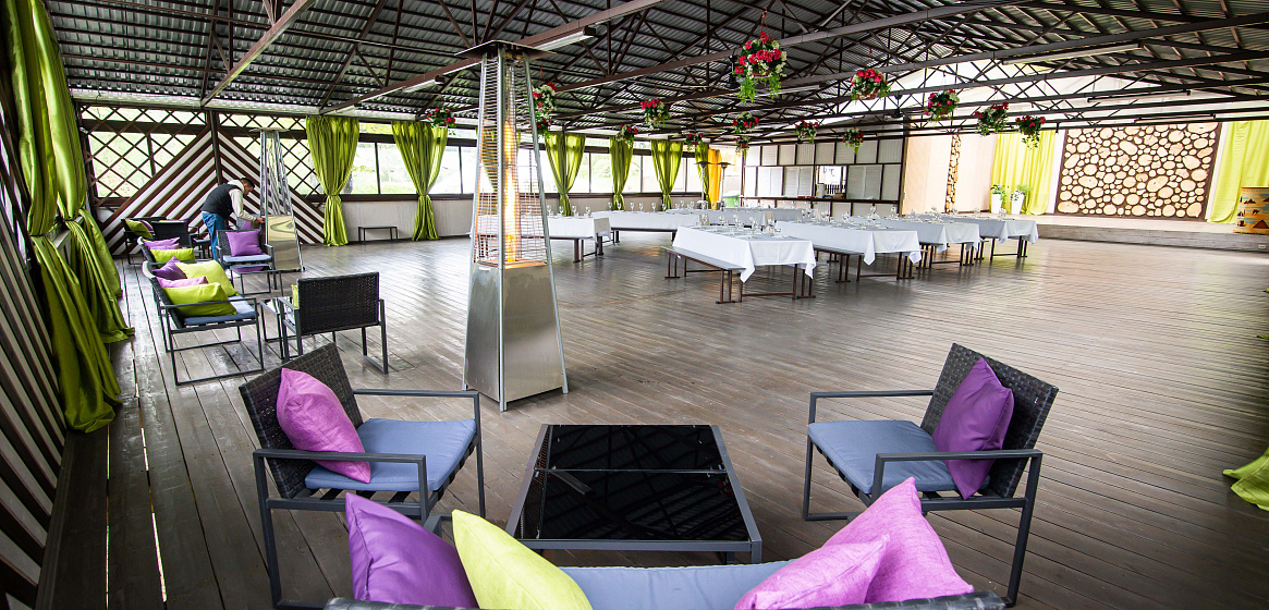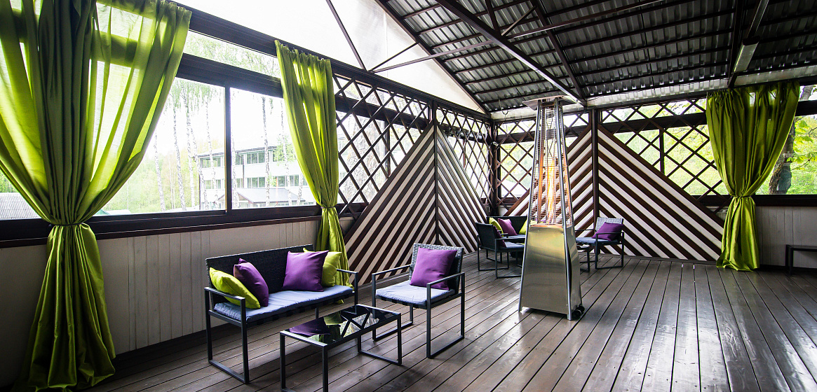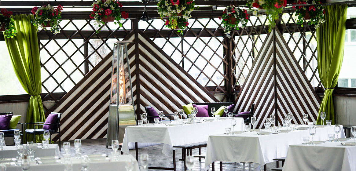 В первую очередь, это большой летний банкетный зал на 350-400 посадочных мест со сценой. Интерьер по задумке дизайнера гармонично вписывается в окружающие сосны и сочную зелень. Легкие шторы и зона релакса создают непринужденное настроение для отдыха. Для того, чтобы гостям было комфортно жарким днем, терраса оснащена мощными вентиляторами.